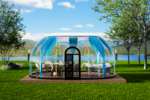 The Panorama Dome Capsule is a striking modular structure created to deliver a unique and immersive indoor experience. Its curved, transparent design allows natural light to flow freely while offering a visually impressive space that blends seamlessly with its surroundings.